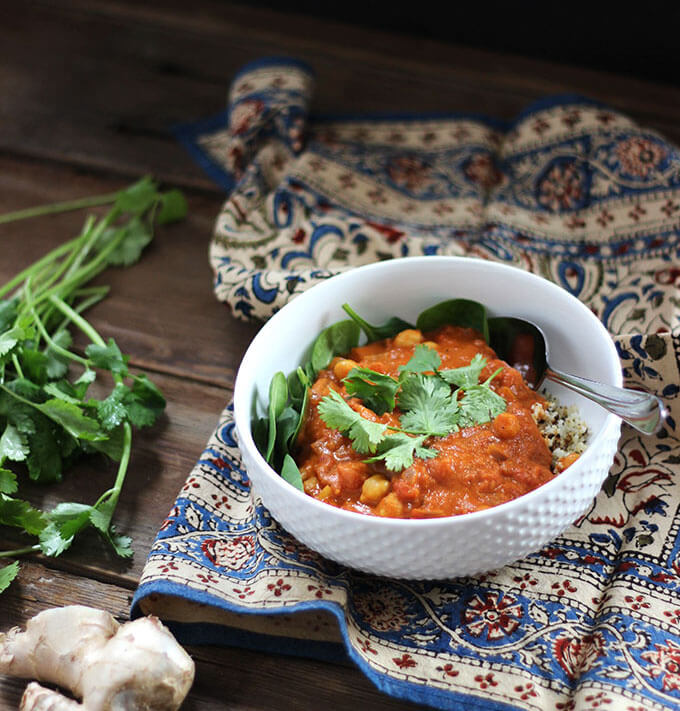 One thing that my foodie heart loves about living in a large city like Chicago is the limitless options for ethnic foods. As a vegetarian, Indian cuisine is often on my radar since they offer so many delicious meatless dishes. Even if you don’t live in a large city where you have access to lots of options, many ethnic foods can be easily recreated at home. This vegan chickpea chana masala recipe is a perfect example of that. This dish is wholesome and filling and took me only about 30 minutes to make on the stovetop. Perfect for weeknight dinner!